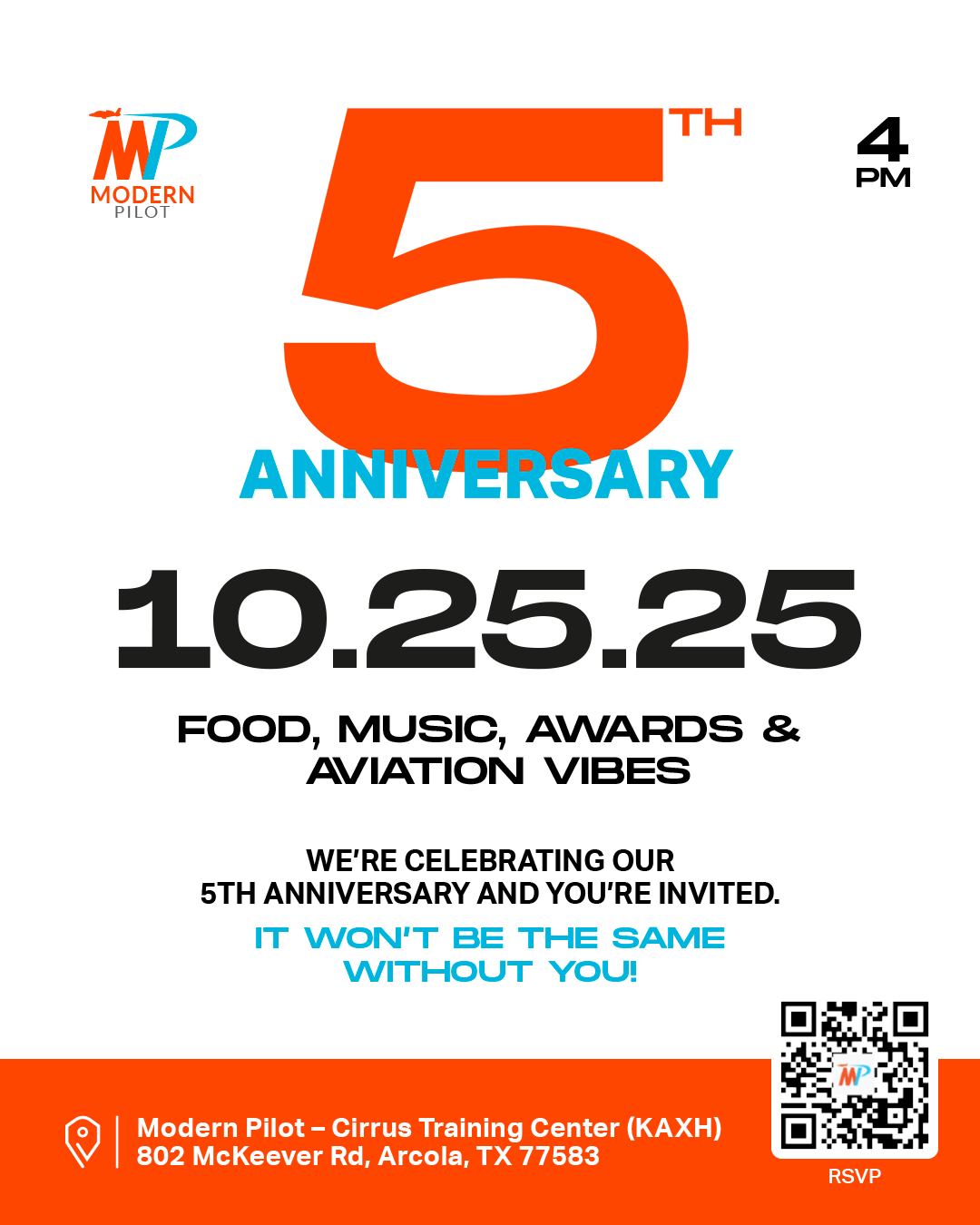 All are welcome to our 5th Anniversary Celebration at the Modern Pilot Cirrus Training Center in Arcola, TX (KAXH).